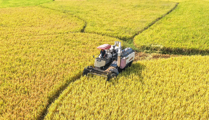 ● 湖南省永州市蓝山县土市镇团结村,村民驾驶收割机在田间收割水稻